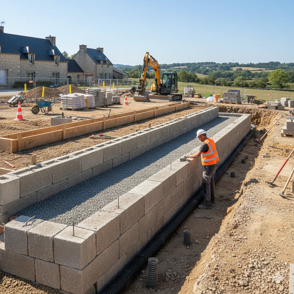 Les fondations assurent la pérennité de votre muret en répartissant les charges sur le sol. Pour un muret de soutènement, une semelle en béton armé est indispensable. La largeur de la semelle doit représenter environ la moitié de la hauteur totale du muret pour garantir sa stabilité. Un ferraillage adapté renforce la résistance aux contraintes. Coulez un béton dosé à 350 kg/m³ minimum sur une épaisseur d'au moins 30 cm pour les petits murets et jusqu'à 50 cm pour les ouvrages plus importants. Le béton doit être vibré pour éliminer les bulles d'air et assurer une densité optimale. Respectez un temps de séchage d'au moins 7 jours avant de poursuivre la construction.